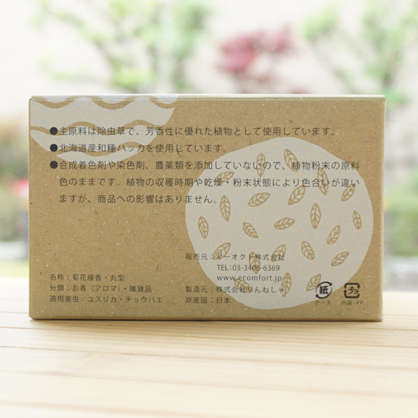 【原料名】除虫草、薄荷(北海道産)、除虫菊末(北海道・中国産)、白樺木粉(北海道産)、タブ粉、でん粉