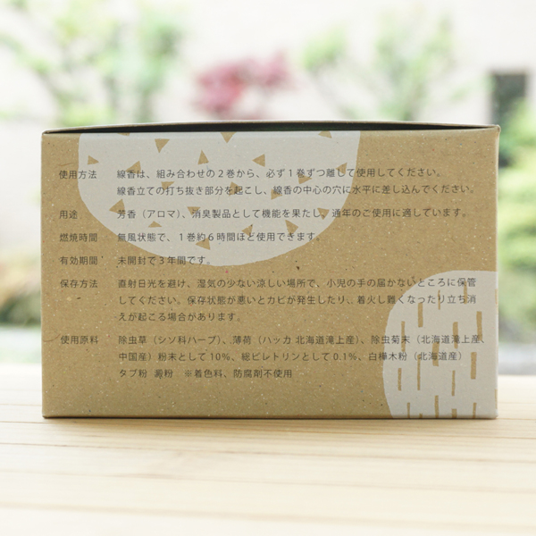 【取扱説明】ディートや合成ピレスロイドを使用していないナチュラルな蚊取り線香です。お子様やペットのいるお部屋でも安心してご使用になれます。