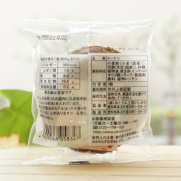 【原料名】小麦粉[小麦(国産)]、豆腐[大豆(国産)]、砂糖、植物油、液全卵、イソマルトオリゴ糖シラップ/膨張剤、香料、植物レシチン