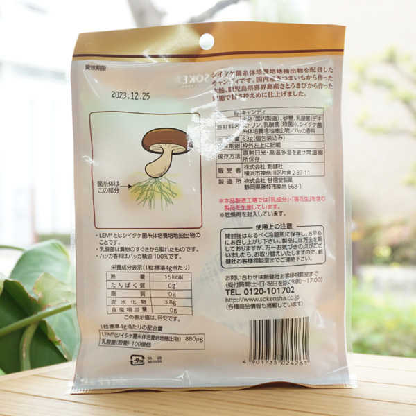 【原料名】水飴(国内製造)、砂糖、乳酸菌(デキストリン、乳酸菌(殺菌))、シイタケ菌糸体培養培地抽出物/ハッカ香料