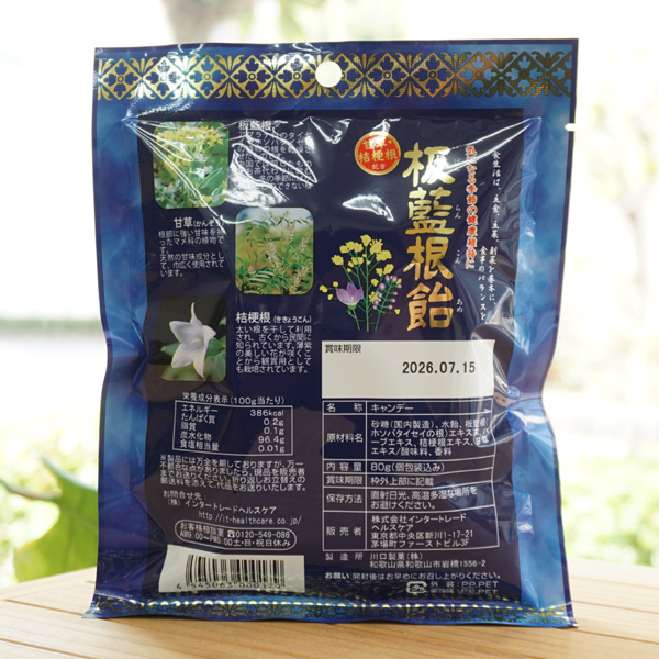 【原料名】砂糖(国内製造)、水飴、板藍根(ホソバタイセイの根)エキス末、ハーブエキス、桔梗根エキス、甘草エキス/酸味料、香料