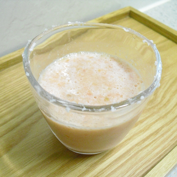 3グラスの飲み口を濡らし、塩を周りにつけ、ミキサーから注ぐ。