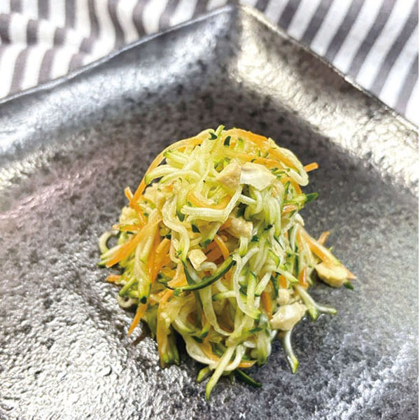 ズッキーニと人参をスライサーでせん切りにし、塩もみして搾り、「カンタン八芳酢とオリーブオイルで和えます。
