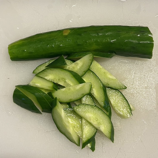 ① きゅうり1/2本を たて半分に切ってから ななめに薄切り