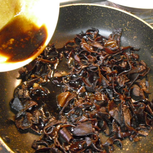 2.フライパンにゴマ油を入れ、戻したキクラゲを炒め、調味料汁を入れ、汁気がなくなる まで煮詰める。