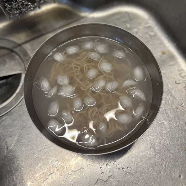 3.ゆで上がったそばをざるにあげ、冷たい水で丁寧に洗ってから水切りしてください。