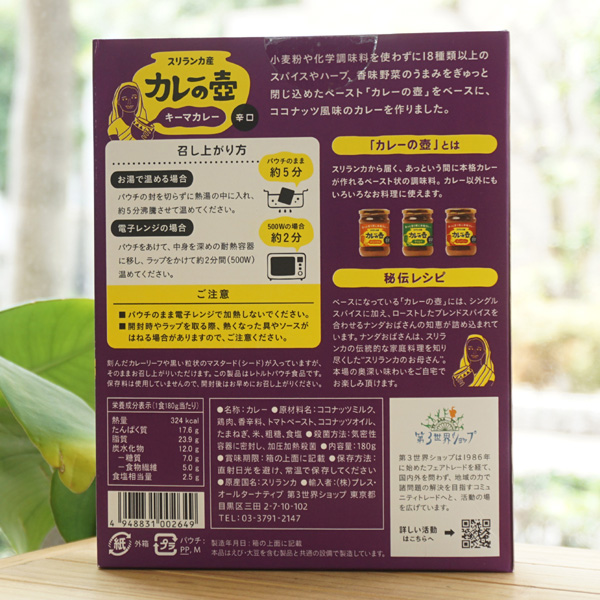12-005 スリランカ産 カレーの壺 キーマカレー(辛口)/180g(1人前)【第3世界ショップ】