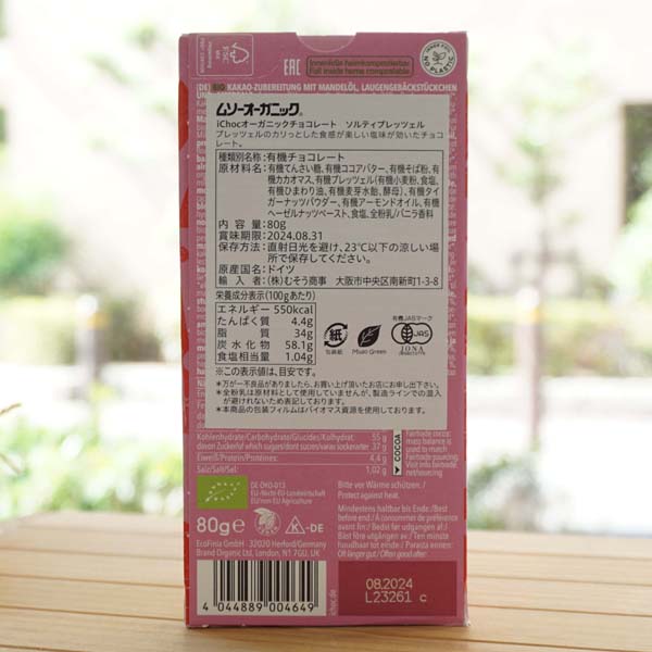 【原料名】有機てんさい糖、有機ココアバター、有機そば粉、有機カカオマス、有機プレッツェル(有機小麦粉、食塩、有機ひまわり油、有機麦芽水飴、酵母)、有機タイガーナッツパウダー、有機アーモンドオイル、有機ヘーゼルナッツペースト、食塩、全粉乳/バニラ香料