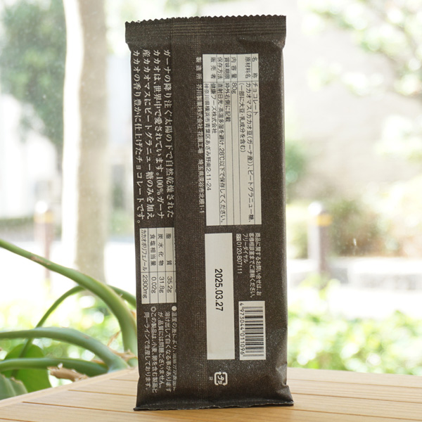 【原料名】カカオマス(カカオ豆(ガーナ産))、ビートグラニュー糖、(一部に大豆・乳成分を含む)
