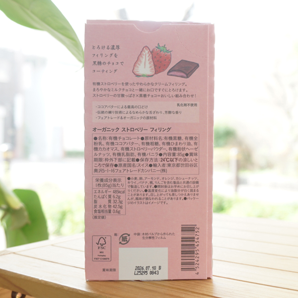 【原料名】有機黒糖、有機全粉乳、有機ココアバター、有機粗糖、有機カカオマス、有機ひまわり油、有機ストロベリーパウダー、有機粉状ヘーゼルナッツ、有機乳脂肪、有機バニラ