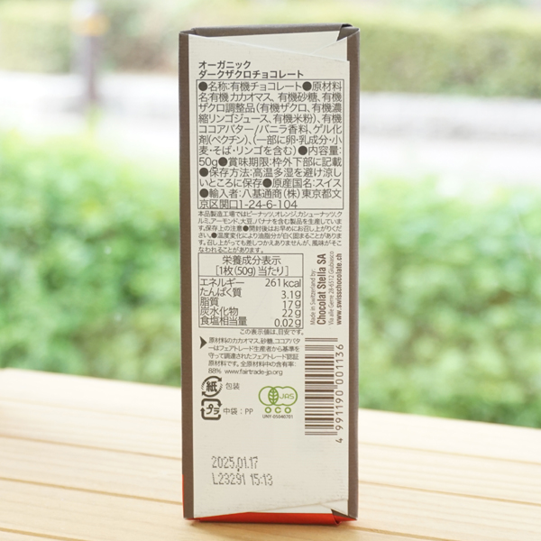 【原料名】有機カカオマス、有機砂糖、有機ザクロ調整品(有機ザクロ、有機濃縮リンゴジュース、有機米粉)、有機ココアバター/バニラ香料、ゲル化剤(ペクチン:リンゴ由来)