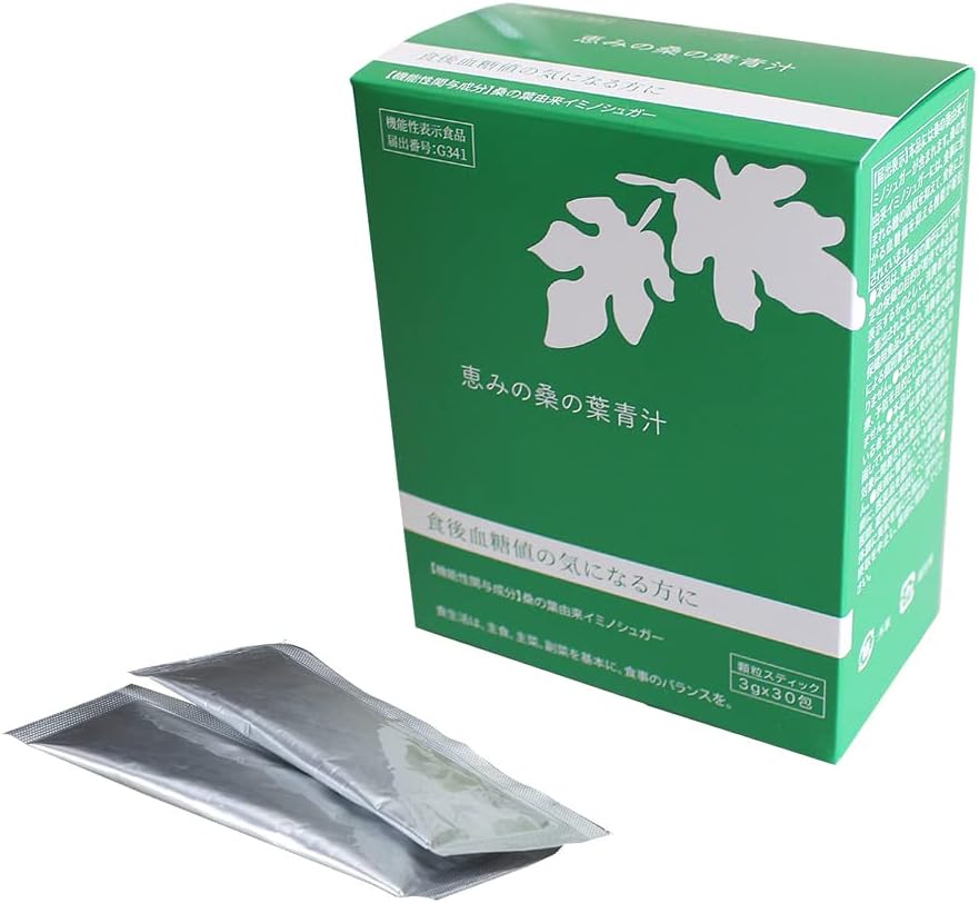 ■届出表示… 本品には桑の葉由来イミノシュガーが含まれます。 桑の葉由来イミノシュガーには、食事に含まれる糖の吸収を抑えて、食後に上がる血糖値を抑える機能が報告されています。