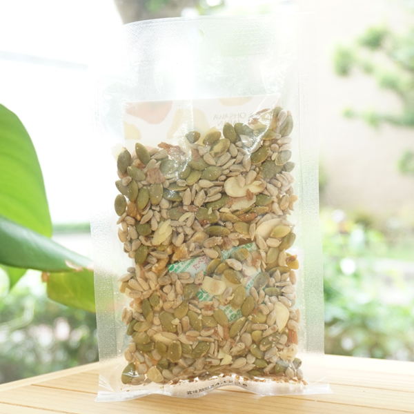 【原料名】かぼちゃの種(中国)、ひまわりの種(ブルガリア)、くるみ・アーモンドスライス(アメリカ)