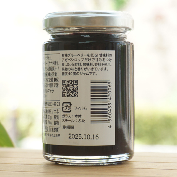 【原料名】有機ブルーベリー(カナダ)、有機アガベシロップ(メキシコ)、有機レモン濃縮果汁/ゲル化剤(ペクチン:柑橘由来)