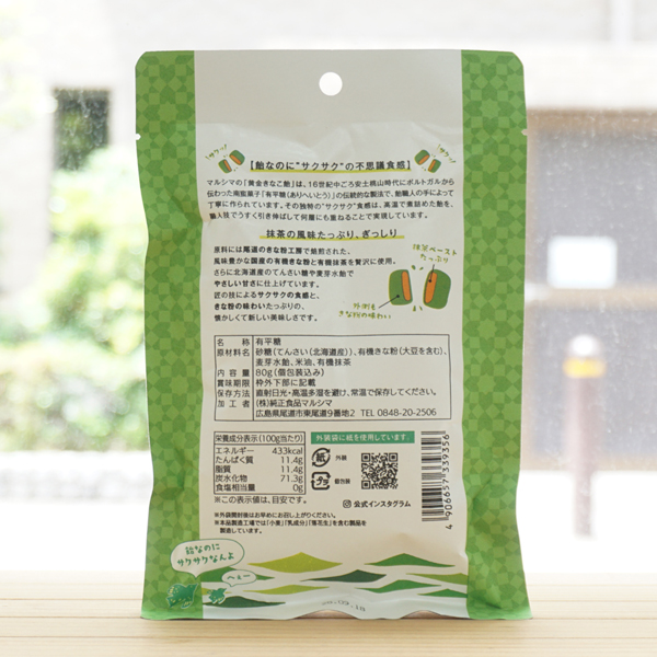 【原料名】砂糖(てんさい(北海道産))、有機きな粉(広島(大豆を含む))、麦芽水飴(千葉)、米油(和歌山)、有機抹茶(静岡)