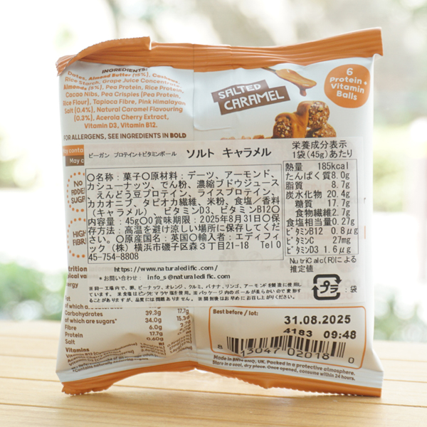 【原料名】デーツ、アーモンドバター、カシューナッツ、でんぷん、濃縮ブドウジュース、えんどう豆プロテイン、アーモンド ライスプロテイン、カカオ、タピオカ繊維、米粉、食塩、濃縮アセロラチェリー/香料(キャラメル風味)、ビタミンD3 ビタミンB12