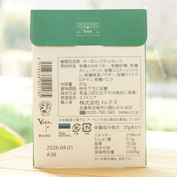 【原料名】有機カカオバター、有機砂糖、有機カシューナッツ、有機ココナッツファイン、有機抹茶パウダー、有機ライスプロテイン、有機バニラ