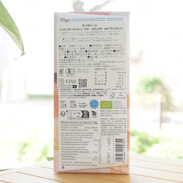 ViVANI オーガニックダークチョコレート デメタ― 100%カカオ  with ブラッドオレンジ/90g【アスプルンド】 Edel Bitter Blutorange 100% Cacao Santo Domingo2