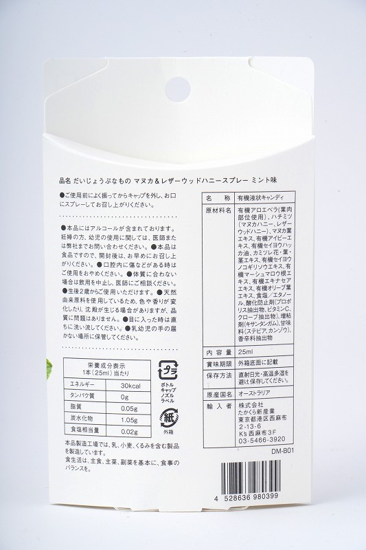 【原料名】有機アロエベラ(葉肉部位使用)、ハチミツ(マヌカハニー、レザーウッドハニー)、マヌカ葉エキス、有機アイビーエキス、有機セイヨウハッカ油、カミツレ花・葉・茎エキス、有機セイヨウノコギリソウエキス、有機マーシュマロウ根エキス、有機エキナセアエキス、有機オリーブ葉エキス、食塩/エタノール、酸化防止剤(プロポリス抽出物、ビタミンC、クローブ抽出物)、増粘剤(キサンタンガム)、甘味料(ステビア、カンゾウ)、香辛料抽出物