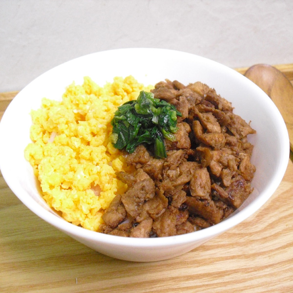 油をひいたフライパンに、エンドウミートとおろししょうが、しょうゆ、みりんで水分がなくなるまで炒め、今回はそぼろ丼にしました
