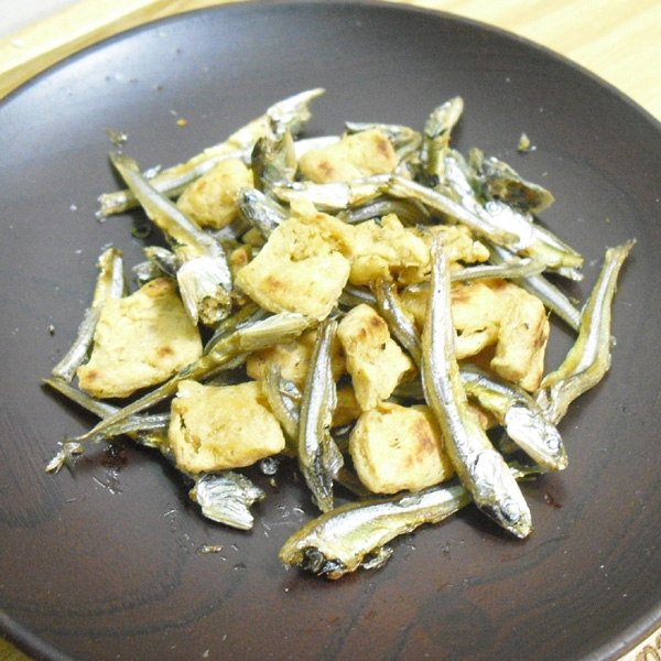 油をひいたフライパンでエンドウミートといりこを煎るだけ。