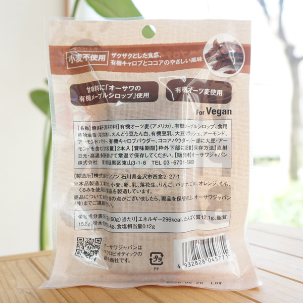 【原料名】有機オーツ麦(アメリカ)、オーサワの有機メープルシロップ、なたね油、えんどう豆たんぱく[えんどう豆(フランス他)]、有機豆乳、大豆クラッシュ[大豆(国産)]、アーモンド・アーモンドパウダー(アメリカ)、有機キャロブパウダー、ココアパウダー