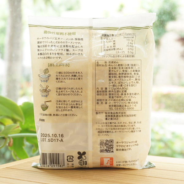 本醸造白たまりを使った香り高く旨みのある塩味 オーサワのベジ玄米ラーメン(しお)/112g for Vegan2