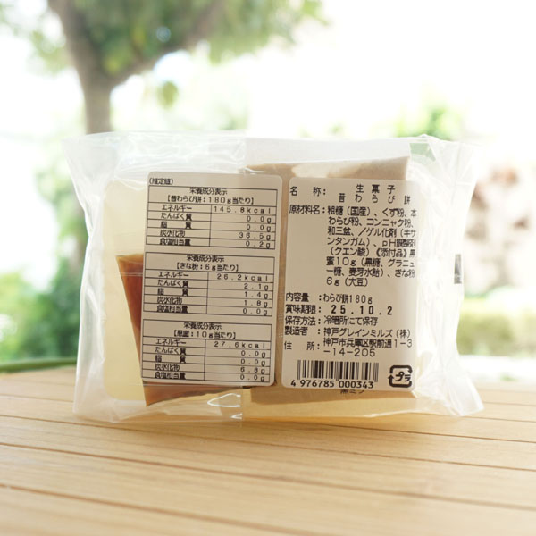 【原料名】粗糖(国産)、くず粉、本わらび粉、コンニャク粉、和三盆、/ゲル化剤(キサンタンガム)、PH調整剤(クエン酸)[添付品]黒蜜10g(黒糖、グラニュー糖、麦芽水飴)、きな粉6g(大豆)