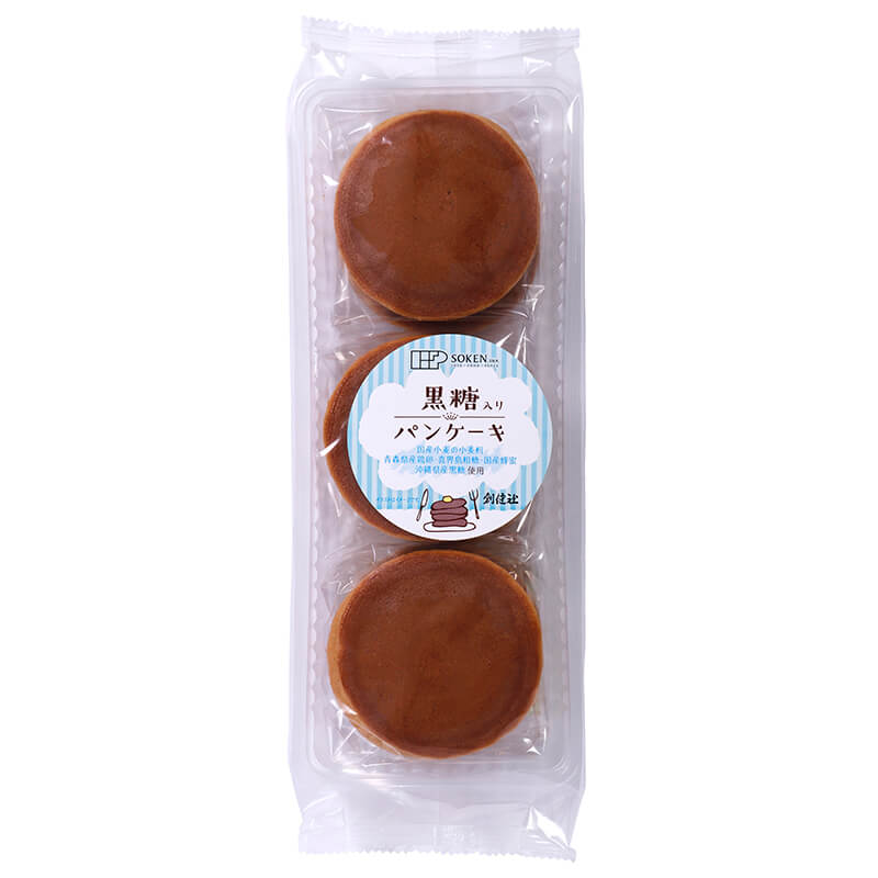 ■国産小麦の小麦粉、青森県産の鶏卵、喜界島産のさとうきび粗糖、国産蜂蜜、沖縄県産黒糖を使用した、黒糖風味のシンプルなパンケーキです。